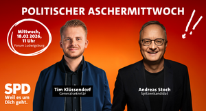 Wir laden euch herzlich zu unserem traditionellen Politischen Aschermittwochein ein. Dieser findet am 18. Februar 2026 im Forum am Schlosspark in Ludwigsburg statt. Wir freuen uns sehr, dass unser Generalsekretär der SPD Tim Klüssendorf uns in Ludwigsburg besucht!